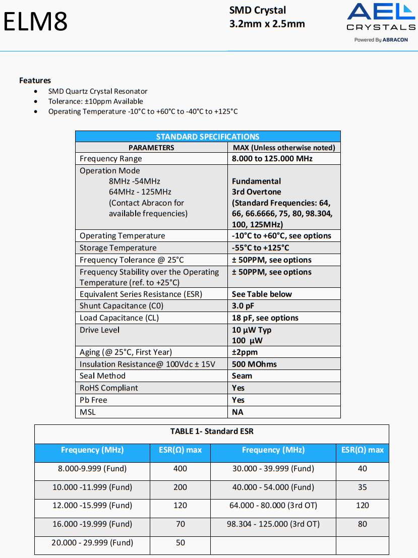| ELM8-18.432MHz-16-R80-DQ-T | AEL Crystals | ELM8 | 18.432 MHz | ±100ppm | ±100ppm | 16 pF |