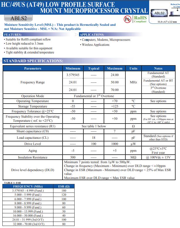 | ABLS2-18.432MHZ-B4Y-T | Abracon晶振 | ABLS2 | MHz Crystal | 18.432MHz |