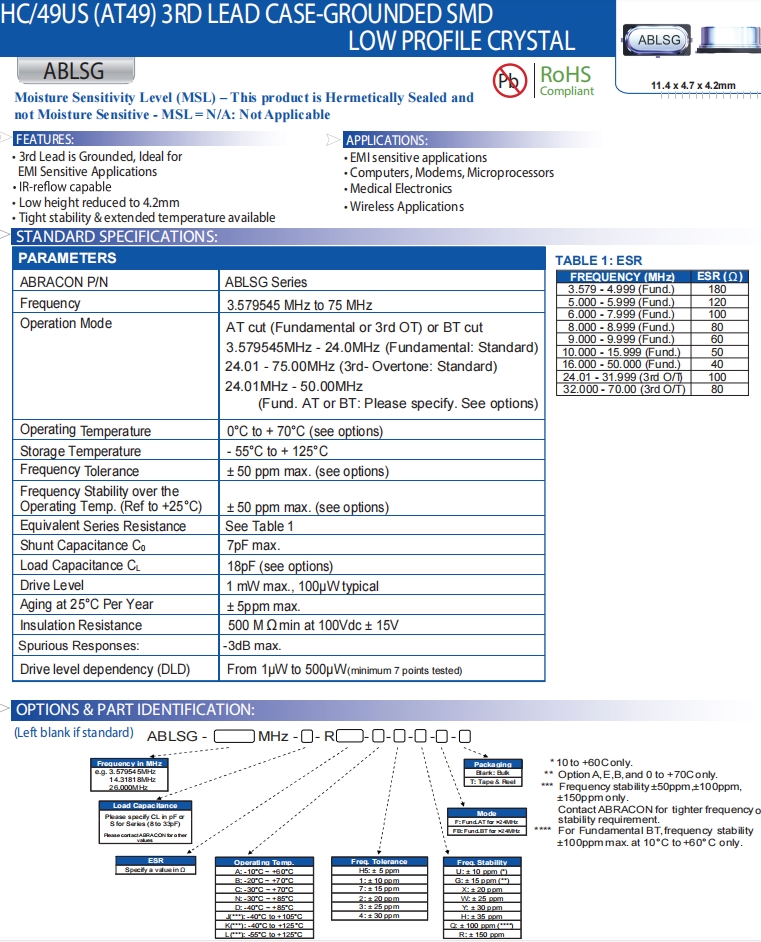 | ABLSG-18.000MHZ-D2Y-T | Abracon晶振 | ABLSG | MHz Crystal | 18MHz |