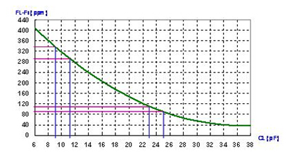 在圖中, CL=24 pF 時的頻率敏感度是10 ppm/pF, 及CL=10 pF時的頻率敏感度是20 ppm/pF. 在并聯(lián)線路中, 負載電容越小, 頻率對負載電容變化的敏感度越高. 相反的, 負載電容越大, 頻率對負載電容變化的敏感度越低. 這就是石英晶體共振子用于VCXO線路上時, 線路設計上會選用較小負載電容. 反之, 在要求較準確的頻率信號時, 線路設計上會選用較高的負載電容.