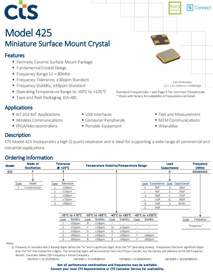 | 425F22A025M0000 | CTS晶振 | 425 | MHz Crystal | 25MHz |