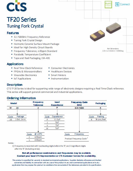 西迪斯晶振TF20,TF203P32K7680R水晶振動子,CTS晶振,無源晶振,石英晶體,貼片石英晶振,SMD晶振,無源諧振器,石英晶體諧振器,小尺寸晶振,型號TF20,編碼TF203P32K7680R是一款金屬面貼片型的音叉晶體,尺寸為2012mm,頻率為32.768KHZ,負載電容12.5pF,精度30ppm,工作溫度-40°C~+85°C,產品具備高質量高性能低損耗的特點,非常適合用于實時時鐘參考,FPGAs和微控制器,可穿戴電子,物聯網應用,消費電子,醫療保健設備,智能電表,儀表等等領域.