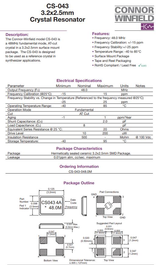 CS-043-048.0M ,3225mm貼片晶振,6G路由器晶振 , ConnorWinfield晶振,CS-043石英晶體諧振器,CS-043-048.0M晶振,無源晶振,3225mm貼片晶振,頻率48MHz,工作溫度-40~85°C,負載8pF,頻率穩(wěn)定性25ppm,高穩(wěn)定性晶振,低老化晶振,6G路由器晶振,頻率合成器晶振,便攜式設(shè)備晶振,醫(yī)療保健晶振,工業(yè)自動化晶振.