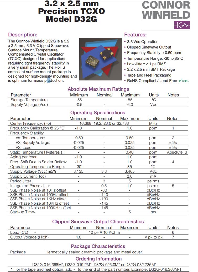 D32G-016.368M|6G模塊晶振|3225mm溫補晶振,ConnorWinfield晶振,D32G有源晶振,D32G-016.368M晶振,3225mm晶振,石英貼片晶振,溫度補償晶體振蕩器,頻率16.368MHz,電壓3.3V,工作溫度-30~85°C,頻率穩定性0.5ppm,低抖動晶振,無鉛環保晶振,6G模塊晶振,北斗導航晶振,通信模塊晶振,儀器設備應用晶振.