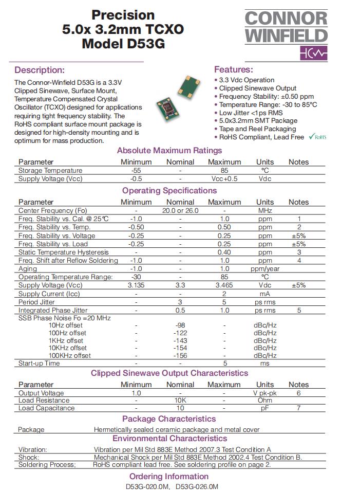 D53G-020.0M|TCXO晶振振蕩器|6G路由器晶振 參數表