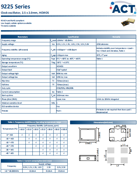 ACT晶振,9225晶振,普通有源晶振.有源晶振,是只晶體本身起振需要外部電壓供應(yīng),起振后可直接驅(qū)動CMOS 集成電路,產(chǎn)品本身已實現(xiàn)與薄型IC(TSSOP封裝,TVSOP封裝)同樣的1mm厚度,斷開時的消費電流是15 µA以下,編帶包裝方式可對應(yīng)自動搭載及IR回流焊接(無鉛對應(yīng))產(chǎn)品有幾種電壓供選1.8V,2.5V,3V3.3V,5V,以應(yīng)對不同IC產(chǎn)品需要.