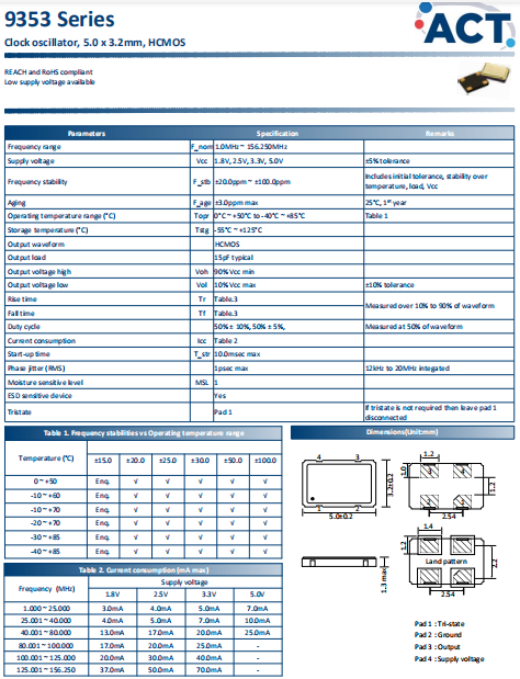 ACT晶振,9353晶振,高質量有源振蕩器.智能手機晶振,產品具有高精度超小型的表面貼片型石英晶體振蕩器,最適用于移動通信終端的基準時鐘等移動通信領域.比如智能手機,無線通信,衛星導航,平臺基站等較高端的數碼產品,晶振本身小型,薄型具備各類移動通信的基準時鐘源用頻率,貼片晶振具有優良的電氣特性,耐環境性能適用于移動通信領域,滿足無鉛焊接的高溫回流溫度曲線要求.