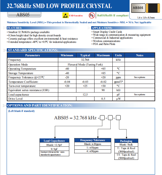 ABRACON晶振,ABS05-32.768KHZ-T晶振,ABS05晶振,耐高溫晶體.1610mm晶振,可以說是目前小型數碼產品的福音,目前超小型的智能手機里面所應用的就是小型的石英晶振,該產品最適用于無線通訊系統,無線局域網,已實現低相位噪聲,低電壓,低消費電流和高穩定度,超小型,質量輕等產品特點,產品本身編帶包裝方式,可對應自動高速貼片機應用,以及高溫回流焊接(產品無鉛對應),為無鉛產品.