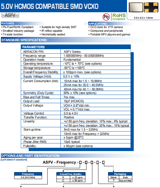 ABRACON晶振,ASFV晶振,VCXO振蕩器.普通貼片石英晶振外觀使用金屬材料封裝的,具有高穩定性,高可靠性的石英晶體振蕩器,晶振外觀本身使用金屬封裝,充分的密封性能,可確保其高可靠性,采用編帶包裝,外包裝采用朔膠盤,可在自動貼片機上對應自動貼裝等優勢.