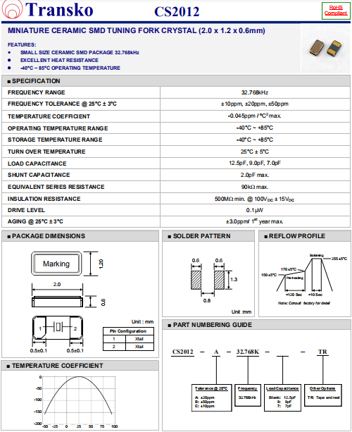 Transko晶振,CS2012晶振,無源環保晶振.小型貼片石英晶振,外觀尺寸具有薄型表面貼片型石英晶體諧振器,特別適用于有小型化要求的市場領域,比如智能手機,無線藍牙,平板電腦等電子數碼產品.晶振本身超小型,薄型,重量輕,晶體具有優良的耐環境特性,如耐熱性,耐沖擊性,在辦公自動化,家電相關電器領域及Bluetooth,Wireless LAN等短距離無線通信領域可發揮優良的電氣特性,滿足無鉛焊接的回流溫度曲線要求.