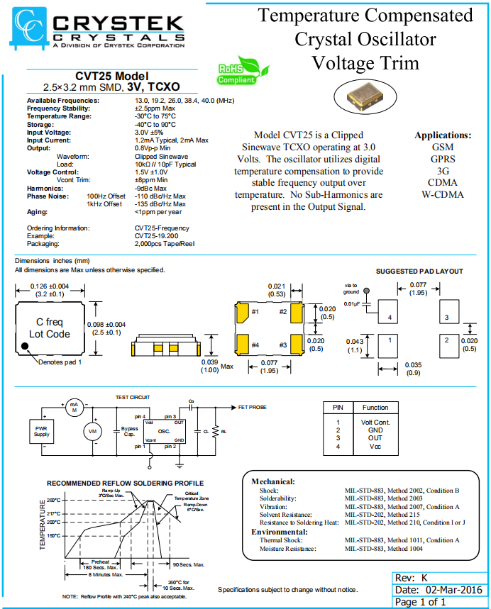 CRYSTEK晶振,CVT25晶振,溫補晶體振蕩器.小型SMD有源晶振,從最初超大體積到現(xiàn)在的7050mm,6035mm,5032mm,3225mm,2520mm體積,有著翻天覆地的改變,體積的變小也試產(chǎn)品帶來了更高的穩(wěn)定性能,接縫密封石英晶體振蕩器,精度高,覆蓋頻率范圍寬的特點,SMD高速自動安裝和高溫回流焊設計,Optionable待機輸出三態(tài)輸出功能,電源電壓范圍:1.8V?5V,高穩(wěn)定性,低抖動,低功耗,主要應用領域:無線通訊,高端智能手機,平板筆記本W(wǎng)LAN,藍牙,數(shù)碼相機,DSL和其他IT產(chǎn)品的晶振應用,三態(tài)功能,PC和LCDM等高端數(shù)碼領域,符合RoHS/無鉛.