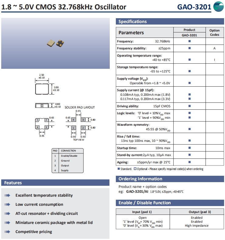 Golledge晶振,GAO-3201晶振,32.768K振蕩器.小型,薄型,質地輕的表面貼片音叉型晶體振蕩器,手機晶體,產品體積小,特別適用于各種小巧的便攜式消費電子數碼產品,在移動通信領域廣泛的應用,晶振產品本身可發揮優良的電氣特性,滿足無鉛焊盤的高溫回流溫度曲線要求.