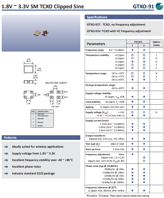Golledge晶振,GTXO-91晶振,TCXO振蕩器.貼片式石英晶體振蕩器,低電壓啟動功率,并且有多種電壓供選擇,比如有1.8V,2.5V,3.3V,3.8V,5V等,產品被廣泛應用于,平板筆記本,衛星系統,光纖通道,千兆以太網,串行ATA,串行連接SCSI,PCI-EXPress的SDH / SONET發射基站等領域.符合RoHS/無鉛..