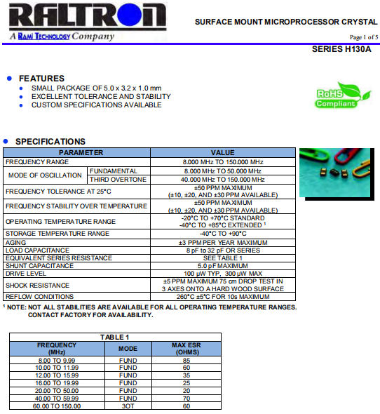 Raltron晶振,H130A晶振,石英晶體諧振器.小型石英貼片5032晶振,外觀尺寸具有薄型表面貼片型石英晶體諧振器,特別適用于有小型化要求的市場領(lǐng)域,比如智能手機(jī),無線藍(lán)牙,平板電腦等電子數(shù)碼產(chǎn)品.晶振本身超小型,薄型,重量輕,晶體具有優(yōu)良的耐環(huán)境特性,如耐熱性,耐沖擊性,在辦公自動化,家電相關(guān)電器領(lǐng)域及Bluetooth,WirelessLAN等短距離無線通信領(lǐng)域可發(fā)揮優(yōu)良的電氣特性,滿足無鉛焊接的回流溫度曲線要求.