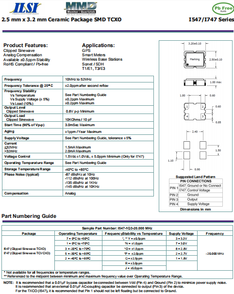 ILSI晶振,I547晶振,溫補振蕩器.有源晶振,是只晶體本身起振需要外部電壓供應,起振后可直接驅動CMOS 集成電路,產品本身已實現與薄型IC(TSSOP封裝,TVSOP封裝)同樣的1mm厚度,斷開時的消費電流是15 µA以下,編帶包裝方式可對應自動搭載及IR回流焊接(無鉛對應)產品有幾種電壓供選1.8V,2.5V,3V3.3V,5V,以應對不同IC產品需要.