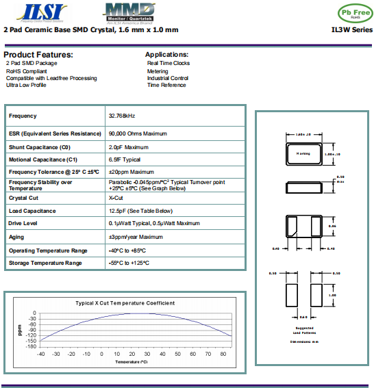 ILSI晶振,IL3W晶振,石英晶體諧振器.32.768K系列具有超小型,薄型,質地輕的表面貼片音叉型石英晶體諧振器,晶振產品本身具備優(yōu)良的耐熱性,耐環(huán)境特性,在辦公自動化,家電領域,移動通信領域可發(fā)揮優(yōu)良的電氣特性,符合無鉛標準,滿足無鉛焊接的回流溫度曲線要求,金屬外殼的石英晶振使得產品在封裝時能發(fā)揮比陶瓷晶振外殼更好的耐沖擊性能.
