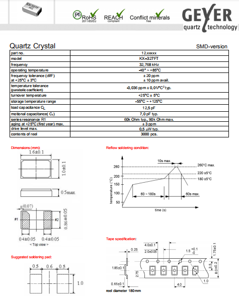 Geyer晶振,KX-327FT晶振,石英晶體諧振器.小體積SMD時鐘晶體諧振器,是貼片音叉晶體,千赫頻率元件,應用于時鐘模塊,智能手機,全球定位系統,因產品本身體積小,SMD編帶型,可應用于高性能自動貼片焊接,被廣泛應用到各種小巧的便攜式消費電子數碼時間產品,環保性能符合ROHS/無鉛標準.