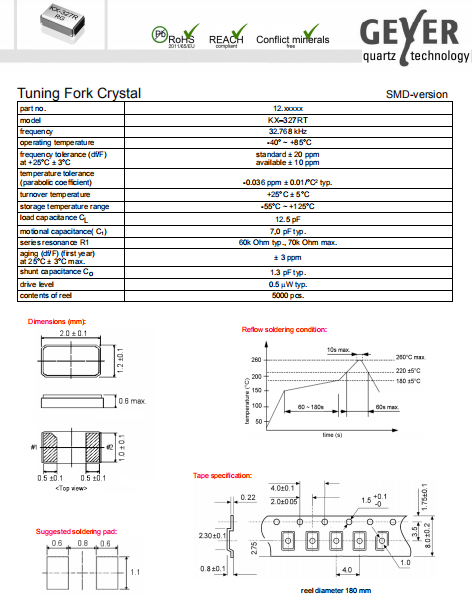 Geyer晶振,KX-327RT晶振,無(wú)源環(huán)保晶振.小體積SMD時(shí)鐘石英晶體諧振器,是貼片音叉晶體,千赫頻率元件,應(yīng)用于時(shí)鐘模塊,智能手機(jī),全球定位系統(tǒng),因產(chǎn)品本身體積小,SMD編帶型,可應(yīng)用于高性能自動(dòng)貼片焊接,被廣泛應(yīng)用到各種小巧的便攜式消費(fèi)電子數(shù)碼時(shí)間產(chǎn)品,環(huán)保性能符合ROHS/無(wú)鉛標(biāo)準(zhǔn).