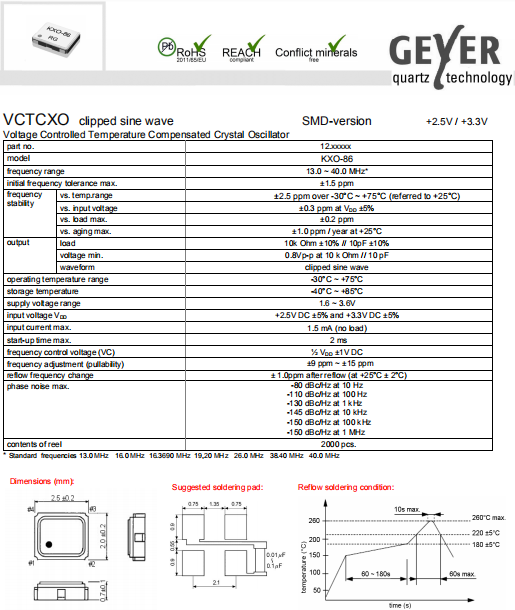 Geyer晶振,KXO-86晶振,VC-TCXO晶振.2520mm體積的石英晶體振蕩器,有源晶振,該產(chǎn)品可驅(qū)動(dòng)2.5V的溫補(bǔ)晶振,壓控晶振,VC-TCXO晶體振蕩器產(chǎn)品,電源電壓的低電耗型,編帶包裝方式,可對(duì)應(yīng)自動(dòng)高速貼片機(jī)自動(dòng)焊接,及IR回流焊接(無(wú)鉛對(duì)應(yīng)),為無(wú)鉛產(chǎn)品,超小型,質(zhì)地輕.產(chǎn)品被廣泛應(yīng)用到集成電路,程控交換系統(tǒng),無(wú)線發(fā)射基站.
