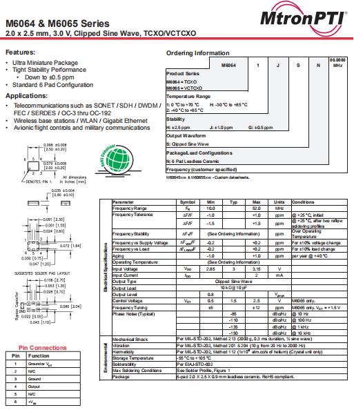 MTRONPTI晶振,M6064晶振,進(jìn)口溫補(bǔ)晶振.小體積貼片2520mm晶振,外觀小型,表面貼片型晶體諧振器,因本身體積小等優(yōu)勢,適用于移動通信終端的基準(zhǔn)時(shí)鐘等移動通信領(lǐng)域.小型,薄型,輕型 (2.5 × 2.0 × 0.9 mm typ.) 具備優(yōu)良的耐環(huán)境特性及高耐熱性強(qiáng).滿足無鉛焊接的回流溫度曲線要求.