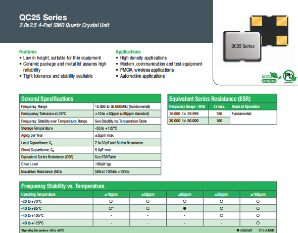 Qantek晶振,QC25晶振,高性能SMD晶振.超小型表面貼片型SMD晶振,最適合使用在通訊電子領(lǐng)域中,也是特別要求高可靠性的引擎控制用CPU的時(shí)鐘部分.低頻晶振可從16MHz起對應(yīng),小型,超薄型具備強(qiáng)防焊裂性,石英晶體在極端嚴(yán)酷的環(huán)境條件下也能發(fā)揮穩(wěn)定的起振特性,產(chǎn)品本身具有耐熱,耐振,耐撞擊等優(yōu)良的耐環(huán)境特性,滿足無鉛焊接以及高溫回流溫度曲線要求.