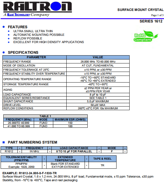 | Raltron晶振 | 單位 | R1612晶振 | 石英晶振基本條件 |