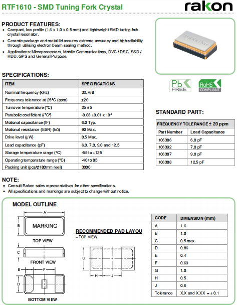 Rakon晶振,RTF1610晶振,音叉石英晶體.超小型,薄型,質(zhì)地輕的表面貼片音叉型晶體諧振器,手機(jī)晶體,產(chǎn)品體積小,特別適用于各種小巧的便攜式消費(fèi)電子數(shù)碼產(chǎn)品,在移動(dòng)通信領(lǐng)域得到了廣泛的應(yīng)用,貼片晶振產(chǎn)品本身可發(fā)揮優(yōu)良的電氣特性,滿足無(wú)鉛焊接的高溫回流溫度曲線要求.