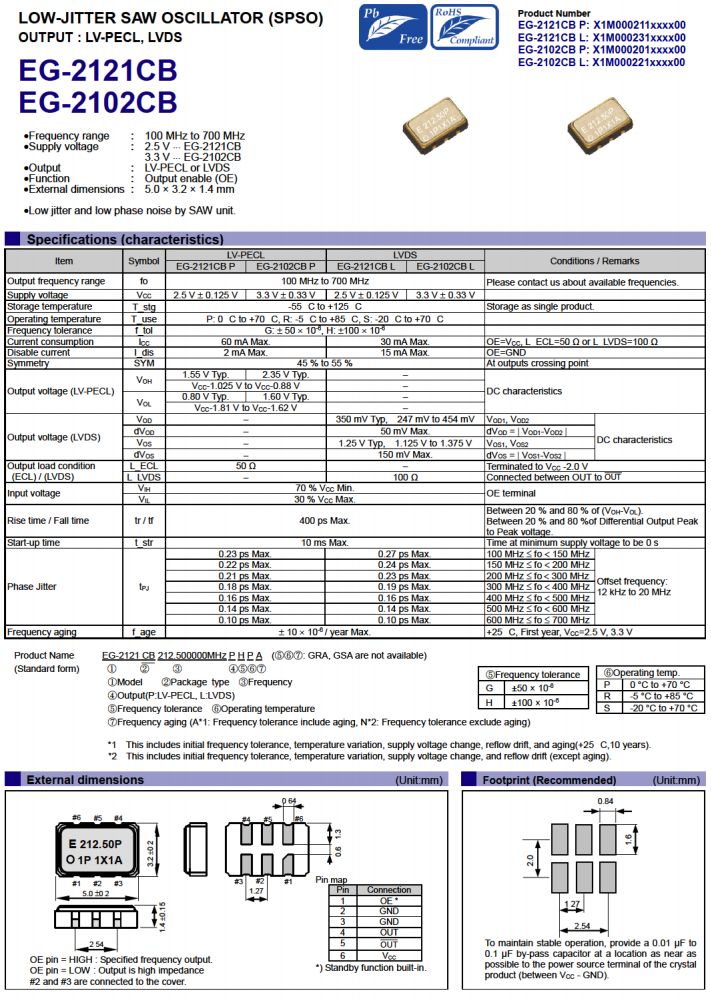 | X1M0002110002 | EG-2121CB | 212.500000 MHz | 5.00 x 3.20 x 1.40 mm | LV-PECL | 2.375 to 2.625 V |