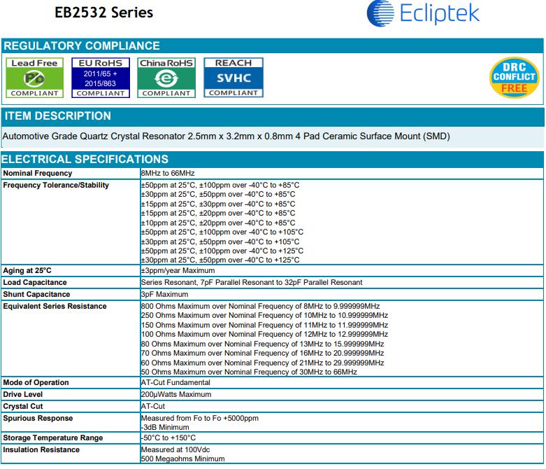 | Ecliptek晶振 | 單位 | EB2532晶振 | 石英晶振基本條件 |