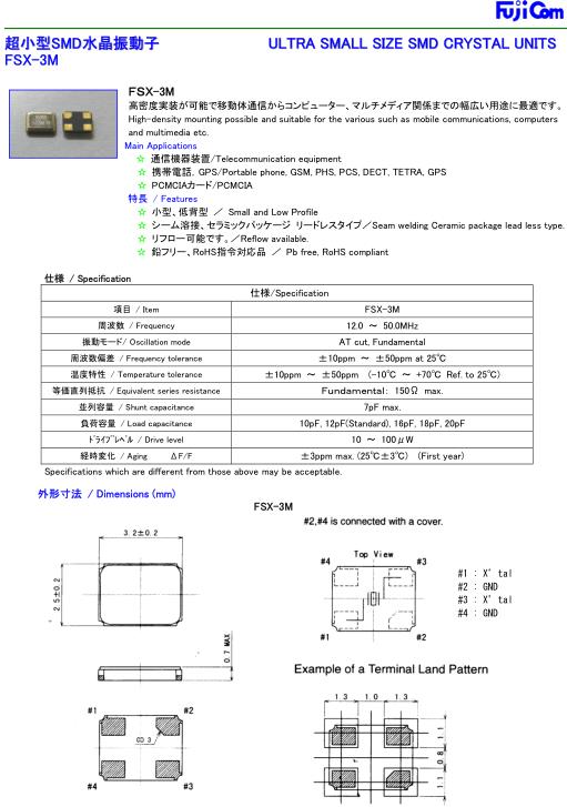 Fujicom晶振,FSX-3M四腳貼片晶振,SMD水晶振動(dòng)子,超小型表面貼片型石英SMD晶振,最適合使用在汽車電子領(lǐng)域中,也是特別要求高可靠性的引擎控制用CPU的時(shí)鐘部分.低頻晶振可從7.98MHz起對(duì)應(yīng),小型,超薄型具備強(qiáng)防焊裂性,石英晶體在極端嚴(yán)酷的環(huán)境條件下也能發(fā)揮穩(wěn)定的起振特性,產(chǎn)品本身具有耐熱,耐振,耐撞擊等優(yōu)良的耐環(huán)境特性,滿足無鉛焊接以及高溫回流溫度曲線要求,符合AEC-Q200標(biāo)準(zhǔn).