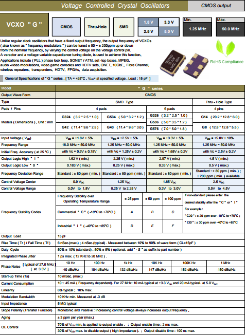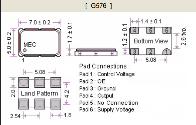 MERCURY晶振,瑪居禮壓控晶振,G576振蕩器.VCXO是指這款晶體產品控制功能只有單壓控也就是電壓控制功能,產品本身頻率精度可以隨著電壓搞定起伏來自動調整頻率,使產品永遠控制在一定的頻率范圍,壓控晶振(VCXO)壓控石英晶體振蕩器基本解決方案,PECL輸出,輸出頻率60 MHz到200 MHz之間,出色的低相位噪聲和抖動,三態功能,應用:SDH/ SONET,以太網,基站,筆記本晶振應用, VCXO,壓控晶體應用:調制解調器,ADSL網絡控制器,無線基站,程控交換設備智能手機,筆記本晶振等.