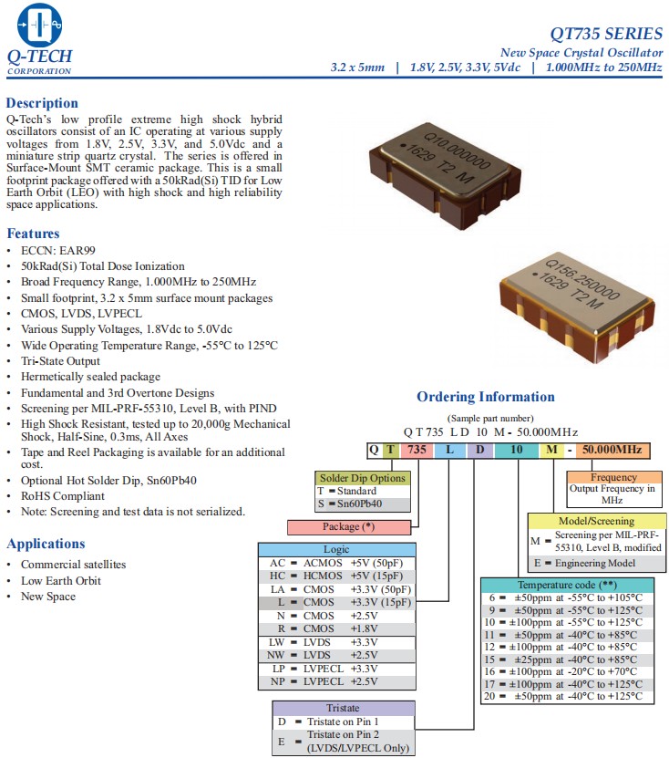 QT735LWE10M-156.250MHz,LVDS差分石英晶振,6G基站晶振, Q-Tech晶振,QT735有源晶振,QT735LWE10M-156.250MHz晶振,電壓3.3V微型石英晶體,LVDS輸出差分石英晶振,頻率156.25MHz,工作溫度-55~125°C,5032mm貼片晶振,小體積晶振,高抗沖擊晶振,高可靠性晶振,低地球軌道應(yīng)用晶振,新空間應(yīng)用晶振,商業(yè)衛(wèi)星應(yīng)用晶振,6G基站晶振.