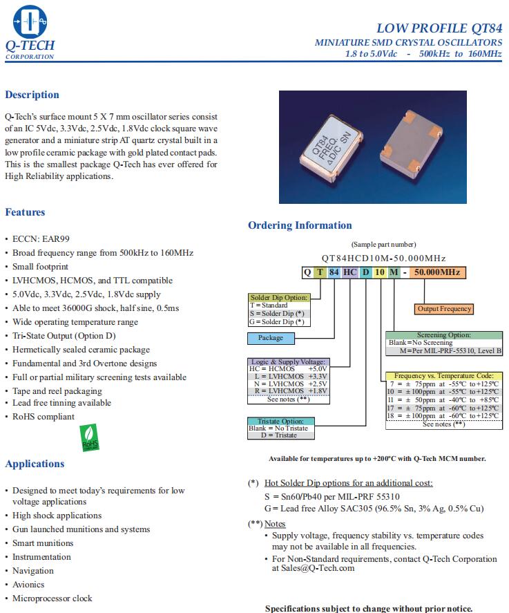 QT84HCD10M-48.000MHz,HCMOS輸出晶振,6G發(fā)射器晶振, Q-Tech晶振,QT84有源石英晶振,QT84HCD10M-48.000MHz晶振,小體積SMD晶振,HCMOS輸出晶振,石英晶體振蕩器,頻率48MHz,工作溫度-55~125°C,電壓5V,頻率穩(wěn)定性100ppm,抗振動晶振,無鉛環(huán)保晶振,高沖擊應(yīng)用晶振,炮射彈藥和系統(tǒng)晶振,智能彈藥晶振,航空電子設(shè)備晶振,GPS導(dǎo)航晶振.