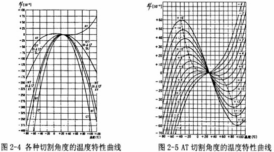 圖2-1是不同切割角度的溫度特性的比較。從圖中可以看出,當(dāng)溫度在大于30℃時(shí),按照AT角度切割的石英晶片的特性曲線比其他的特性曲線都平坦,說明在此溫度范圍內(nèi)溫度變化后頻率產(chǎn)生的偏移量最小,溫度特性也最佳,如圖2-5所示,同是AT切割的時(shí)候,當(dāng)切割角度有少量偏差時(shí)溫度特性曲線也會(huì)隨之變化。