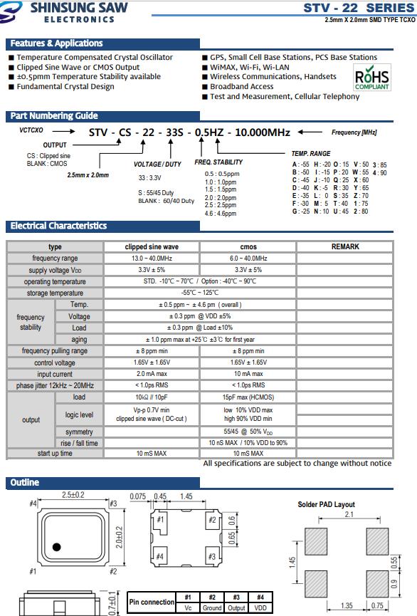 SHINSUNG韓國晶振,STV-22無線通信振蕩器,STV-CS-22-33S-0.5HZ-12.000MHz晶振,有源晶振,是指晶體本身起振需要外部電壓供應,起振后可直接驅動CMOS集成電路,產品本身已實現與薄型IC(TSSOP封裝,TVSOP封裝)同樣的1mm厚度,斷開時的消費電流是15µA以下,編帶包裝方式可對應自動搭載及IR回流焊接(無鉛對應)產品有幾種電壓供選1.8V,2.5V,3V3.3V,5V,以應對不同IC產品需要