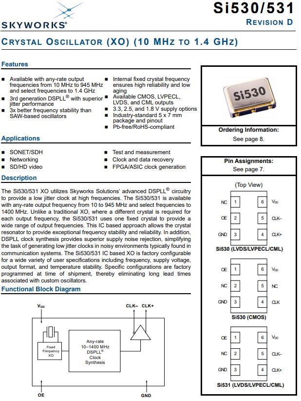 有源晶振應用領域:SONET/SDH,網絡,SD/HD視頻,測試與測量,時鐘和數據恢復,FPGA/ASIC時鐘生成.具備快速交貨Silicon高質量的時鐘晶體振蕩器編碼曝光530CA40M0000BG.