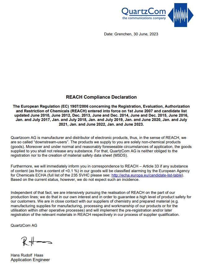 Quartzcom AG is manufacturer and distributor of electronic products, thus, in the sense of REACH, we are so called “downstream-users”. The products we supply to you are solely non-chemical products (goods). Moreover and under normal and reasonably foreseeable circumstances of application, the goods supplied to you shall not release any substance. For that, QuartzCom AG is neither obliged to the registration nor to the creation of material safety data sheet (MSDS).