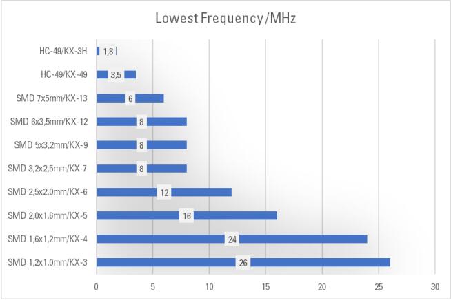 小石英晶體只有在8MHz以上可用,這個最小頻率隨著封裝變小而增加。這是由于在每個晶體的邊緣的自然干涉和不希望的振蕩模式。如果不適當地抑制這些干擾,就會產生假共振。在低頻時,石英圓盤的厚徑比較大,邊緣效應的抑制變得更加困難。
