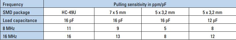 表2:不同尺寸振蕩晶體的拉靈敏度,負載電容與本設計中的典型值相對應。