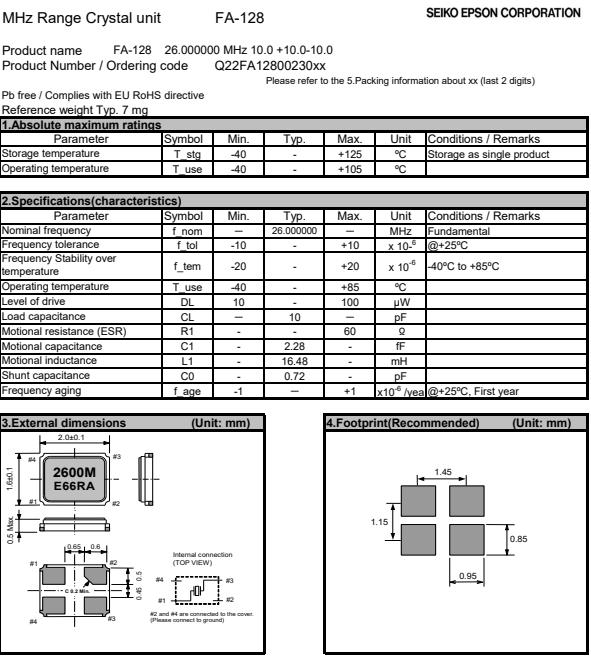 | Q22FA1280022600 | 2 x 1.6 x 0.5mm | FA-128 | 26.000000 MHz | 8 pF | +/-10 ppm |