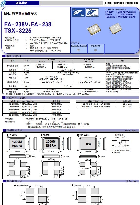 日本愛普生晶振TSX3225,是一款小體積晶振尺寸3.2x2.5mm無源晶振,石英晶體諧振器,四腳貼片晶振,具有超小型輕薄型,耐高溫,耐熱及耐環境特性,該產品已被確定的高信賴性最適合用于汽車電子部件,導航、遠程呼叫、緊急救援、防盜跟蹤、道路救援、電話、資訊娛樂,自動駕駛等等,為了實現人與汽車系統自由的交互,并提供實時的信息互動、交通、天氣等功能,汽車對車規級晶振的依賴只會越來越強。在極端嚴酷的環境條件下也能發揮穩定的起振特性,工作溫度要達到-40到+85℃(+105℃),常見的3225封裝貼片晶振FA-238A、TSX-3225、FA-238V/FA-238等.