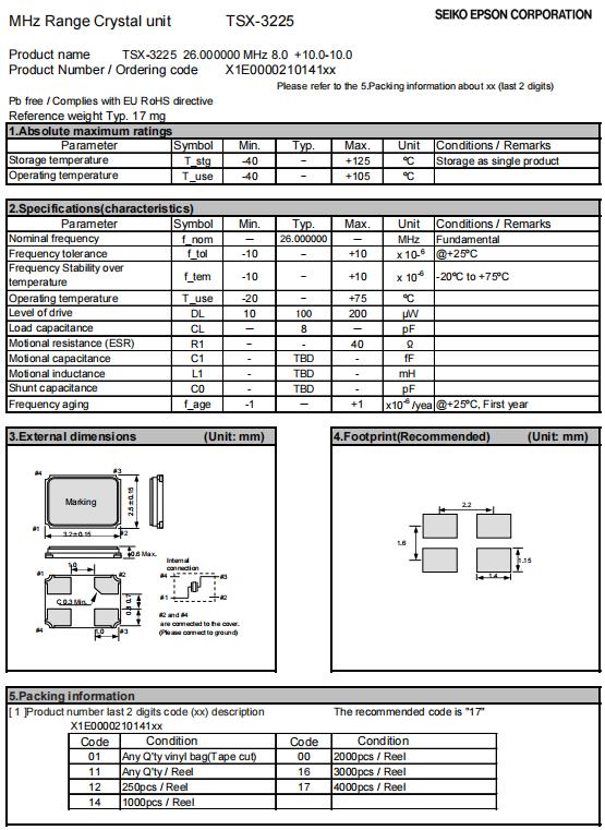 | X1E000021014216 | 3.2 x 2.5 x 0.6mm | TSX-3225 | 26.000000 MHz | 9 pF | +/-10 ppm | +/-10 ppm | -20 to +75 °C | ≤ 40 Ω |