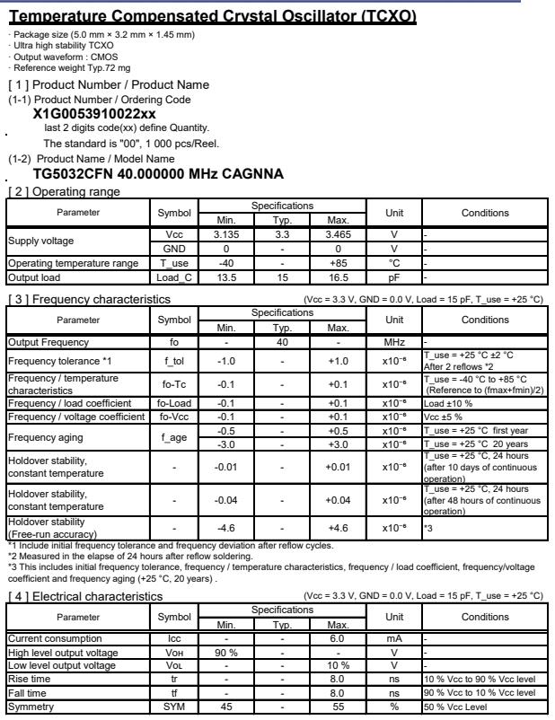 | X1G005391002200 | TG5032CFN | 40.000000 MHz | 5.00 x 3.20 x 1.45 mm | CMOS | 3.135 to 3.465 V | +/-1.0 ppm | -40 to ++85 °C |