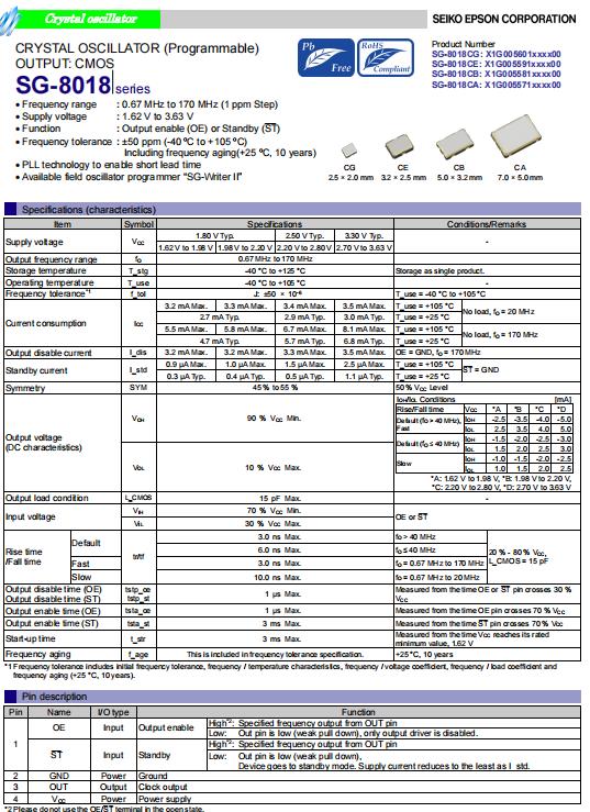 | X1G005601020100 | SG-8018CG | 1.000000 MHz | 2.50 x 2.00 x 0.80 mm | CMOS | 1.620 to 3.630 V | -40 to 105 °C | +/-50 ppm |