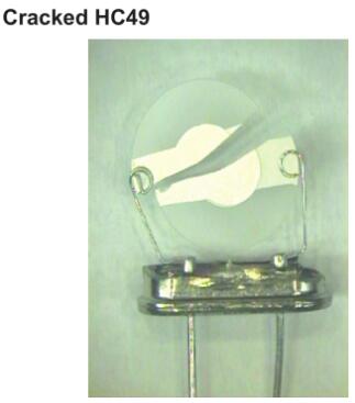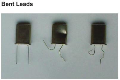 引線過度彎曲會損壞玻璃與金屬的密封,從而導(dǎo)致外殼的氣密性喪失。外殼充滿干燥的惰性氣體,氣密性的喪失會導(dǎo)致產(chǎn)品由于大氣污染而迅速劣化。因此,在處理晶體時應(yīng)注意不要拉扯或彎曲引線。如果需要通過彎曲的方式移動組件,則應(yīng)將引線稍微彎曲一點,使其遠離玻璃密封件,以免破裂。推薦的最小曲率半徑取決于產(chǎn)品,例如HC49晶體為2mm,UM1s為1mm。