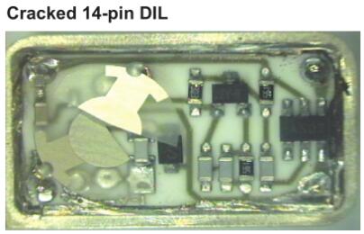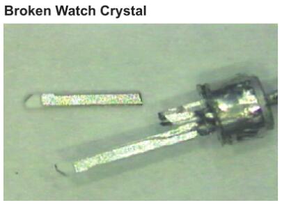 電極通過玻璃對金屬的密封或通過SMD陶瓷封裝(見圖1)連接到穿過基座的引線。電極通過鍍層陶瓷連接到焊盤。晶體單元通常與其他電路封裝在一起,以實現(xiàn)功能齊全的模塊,例如振蕩器或復(fù)數(shù)濾波器。圖2和圖3說明了簡單的石英晶體振蕩器。由于晶體單元的性質(zhì),正確處理非常重要。以下從多個方向入手為大家講講晶振產(chǎn)品損壞解析說明。