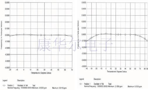 例如,如果將晶振指定為0~+60℃以上的溫度,則它最有可能在-40~+85℃以上的溫度下運行而沒有任何問題.但是,它可能會超出其指定的穩定性.如果應用程序僅需要一個穩定的頻率而不是一個準確的頻率,則可能無關緊要.以下是在兩個不同溫度范圍內測試同一石英晶體振蕩器的測試結果.左邊的溫度是-20~+70℃.如您所見,它非常穩定.右邊的一個是從-40~+85℃.它不再像在穩定的極端溫度.如果溫度穩定性在您的系統中至關重要,則必須在規格范圍內進行操作.