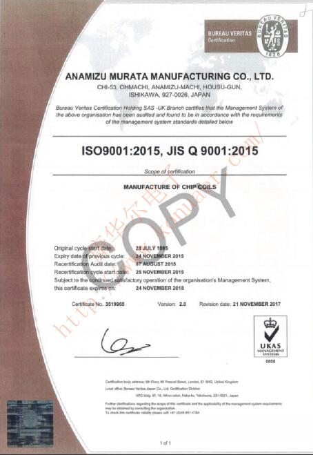 XRCGB24M576FAN00R0村田石英晶體ISO9001品質(zhì)認證證書