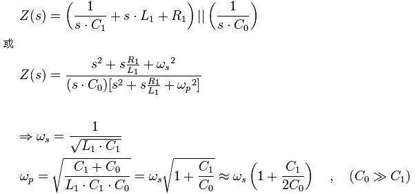 個(gè)頻率接近但特性不同的共振點(diǎn):低阻抗的串聯(lián)共振點(diǎn)與高阻抗的并聯(lián)共振點(diǎn)。 運(yùn)用拉普拉斯轉(zhuǎn)換,該等效電路網(wǎng)絡(luò)的阻抗可以寫成以下數(shù)學(xué)式: