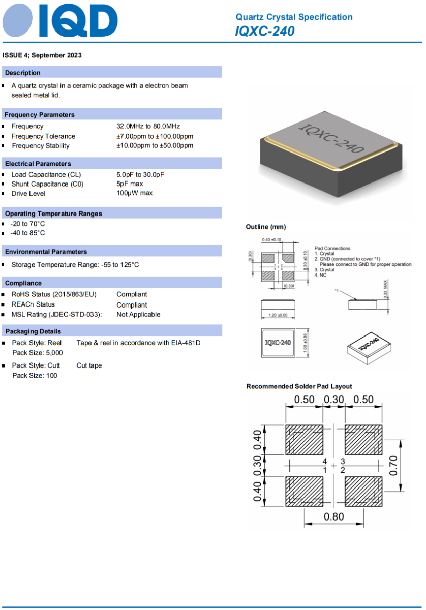 Housed in a 4-pad ceramic hermetically sealed package with an electron beam sealed metal lid, which helps to minimise the EMI radiation. The product is designed to be able to withstand shock levels of up to 1000G in accordance with IEC 60068-2-27. The IQXC-240 is available on tape and reel in accordance with EIA-481D.技術支持